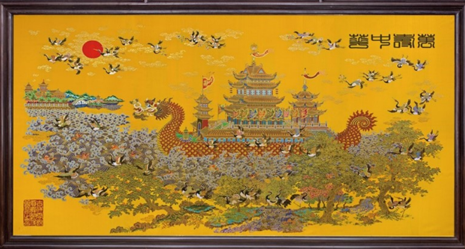 中国南京云锦博物馆典藏一件云锦作品《万寿中华》,56只飞翔的仙鹤代表着的56个民族,一同在华夏这艘龙舟上,共同祝愿祖国永远繁荣昌盛。