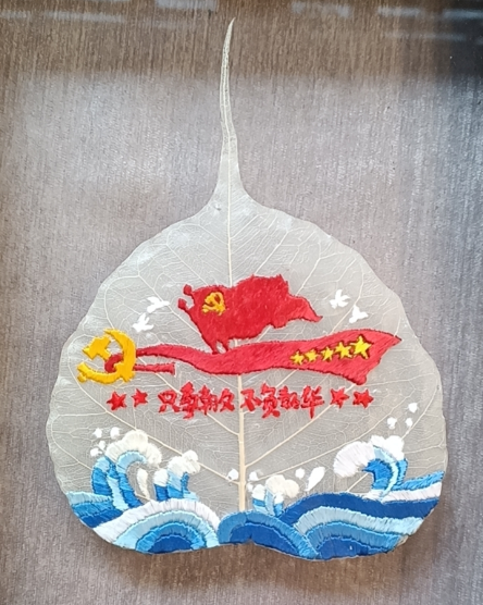 近年来,高瑞雷一直在不断创新,他将日常生活用品加入刺绣元素。“这是一片树叶,经过特殊的处理后,在上面刺绣,绣在叶脉之上,所以称为叶脉绣。”高瑞雷告诉记者,“上面有中国共产党党旗和五角星等,下面是浪花,寓意是我们每个人都是一朵独特的浪花,汇聚成祖国的巨浪。在这个伟大的时代,国家正以惊人的速度发展,我们应只争朝夕、不负韶华,为国家贡献一份力量,为民族的复兴添砖加瓦。”