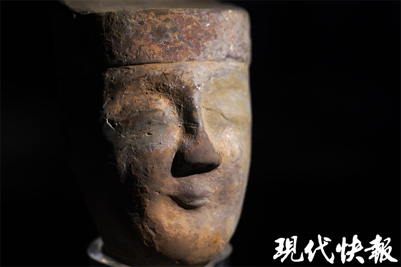 现在我们生活中,玻璃是日用。但,1600多年前,玻璃是超级奢侈品。展厅中,4枚玻璃杯碎片静静躺在独立展柜中,透着神秘的时代光泽。玻璃壁非常非常薄,看起来与现今玻璃片一般无二。它们出土于陵墓侧室的甬道。根据这些残片,专家推测,原器是一件敞口折唇、腹部略鼓起的玻璃杯。经分析,这是典型的钠钙玻璃,其中钾、镁的含量较低。