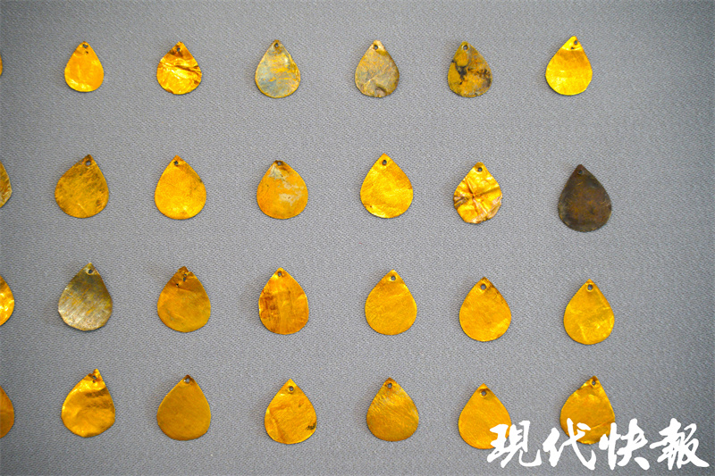 4枚金珰饰片,Blingbling的,工艺让人忍不住叫绝。其中一枚蝉纹金珰,山形,顶部尖起,圆肩,内饰镂空蝉纹,双目金珠完整。边缘及纹样主线条上,装饰着连续的粟粒纹及金珠。南京大学考古学博士、展览执行人魏美强介绍说,“它们分别出土于主室西北、主室甬道、侧室甬道,经光谱分析,金饰纯度很高,杂质成分有铜、银、铁、硅等。”
