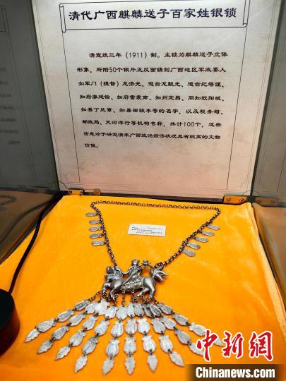 另一个清代麒麟送子百家姓银锁以细致而复杂的工艺引来围观。这套银锁的主锁为麒麟送子立体形象,钩挂50个银片的正反面镌刻当时广西地区军政要人名字及多个机构名称。据悉,这些信息对于研究清末广西社会政治、经济状况颇具价值。