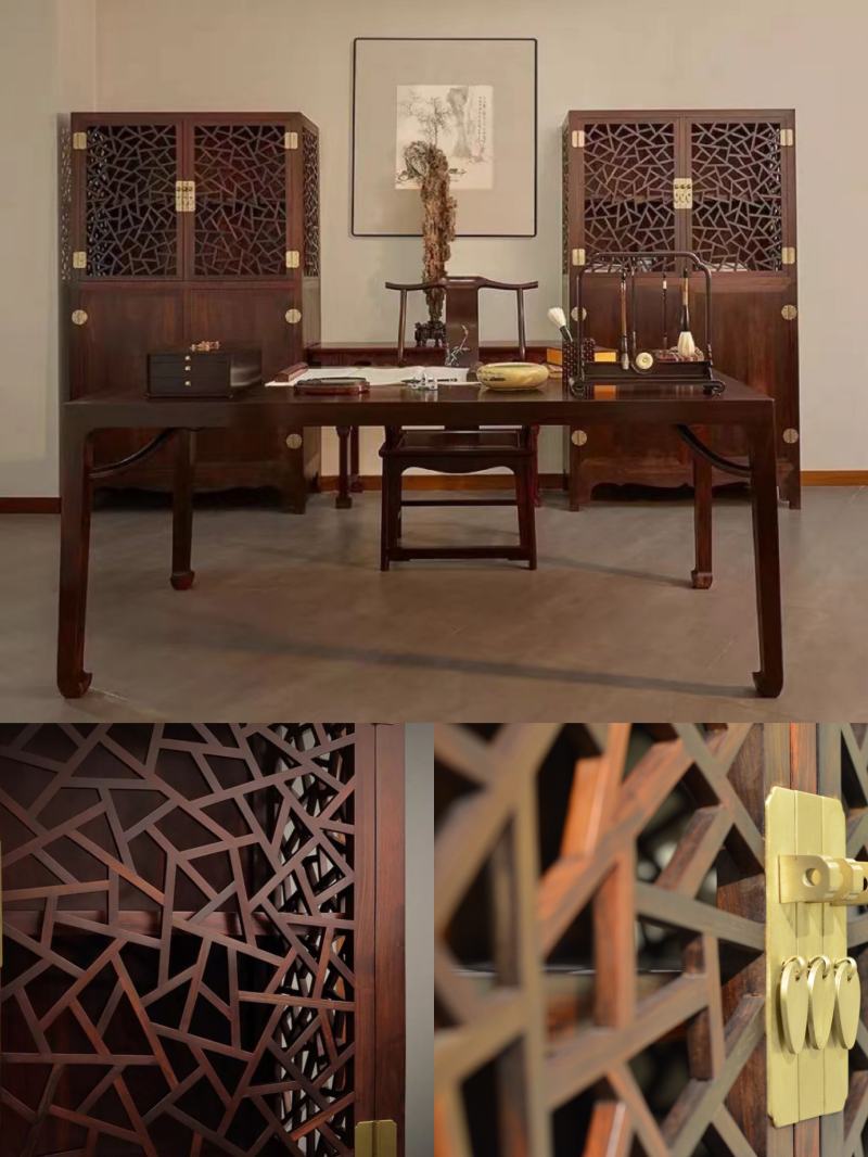 而红酸枝冰裂纹书柜则是一件传统与创新的古典家具。精美的冰裂纹部分,都是细密的榫卯连接,采用纯手工打造。书柜下面采用对开门式,可以满足储物功能。上面书阁的空灵与下面柜门的封闭,形成虚与实的对比。