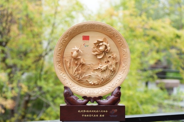 这款木雕作品是中国体育代表团送给亚残运村的礼品。10月16日上午,参加杭州第4届亚残运会的中国体育代表团入驻亚残运村。在入村仪式上,亚残运村和代表团互相交换了礼物。