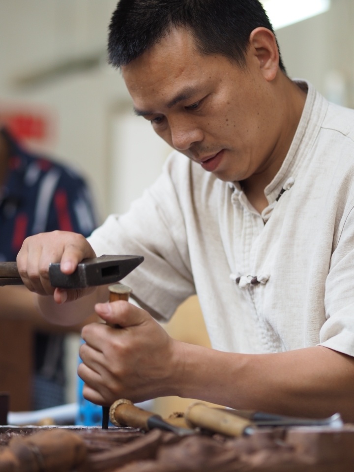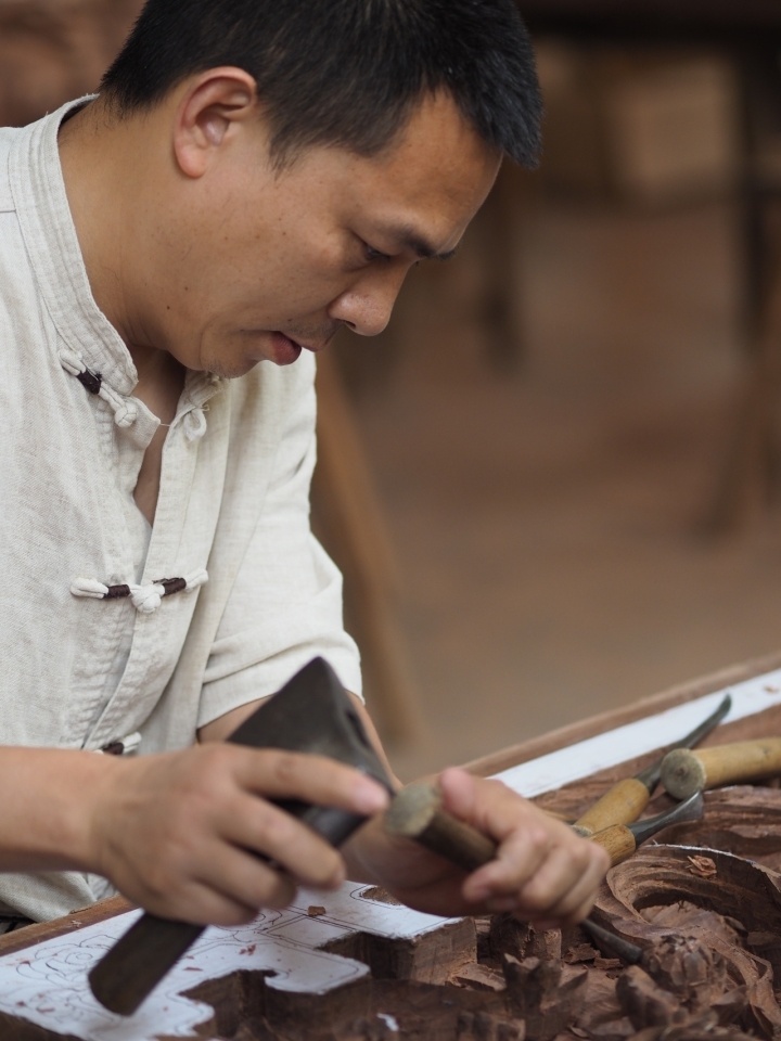 “我从小就喜欢画画,接触木雕以后就爱上了这个行业。”入行之初,胡先民为了为练好基本功,常常几千次、上万次地练习。“耐心吃苦”是他认为进入这个行业必备的品质。