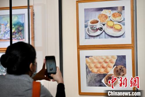 10月19日,香港一新美术馆举行《太平景象》画展。图为画家笔下具香港特色的菠萝包、奶茶、鸡蛋仔及砵仔糕等美食。 中新网记者李志华摄