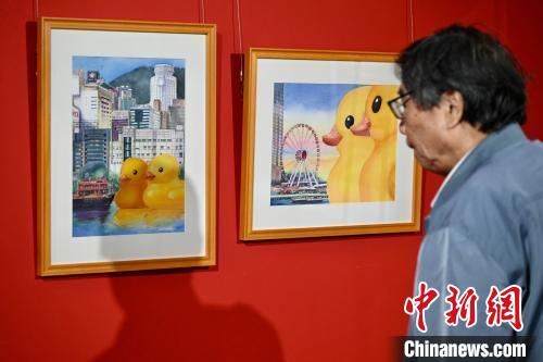 10月19日,香港一新美术馆举行《太平景象》画展。图为画家笔下的小黄鸭在香港维港停留。 中新网记者李志华摄