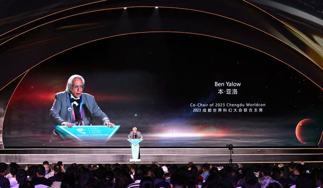 10月22日晚,在第81届世界科幻大会闭幕式上,2023成都世界科幻大会联合主席本·亚洛致辞。新华社发