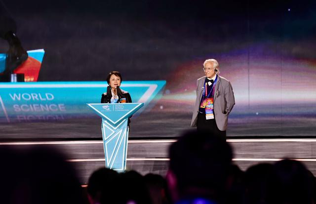 10月22日晚,在第81届世界科幻大会闭幕式上,2023成都世界科幻大会专职主席梁效兰(左)致辞。新华社发