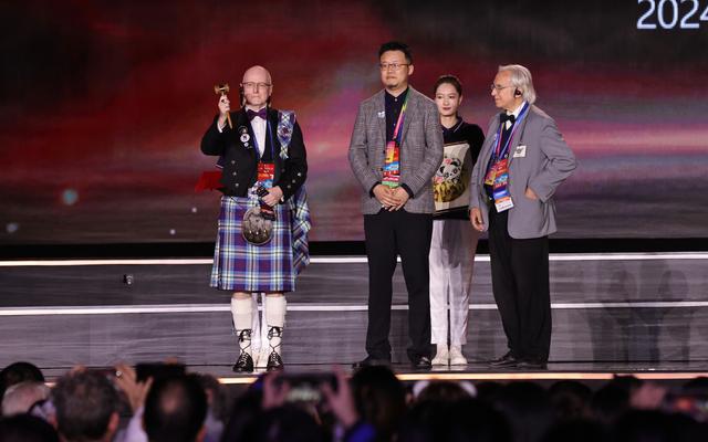 10月22日晚,在第81届世界科幻大会闭幕式上,2023成都世界科幻大会联合主席陈石(前中)将世界科幻大会“法槌”交与2024格拉斯哥世界科幻大会代表文森特·多切蒂(前左)。新华社发