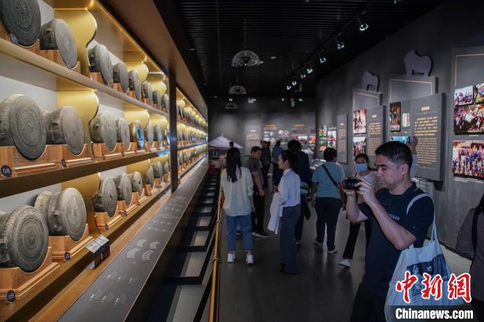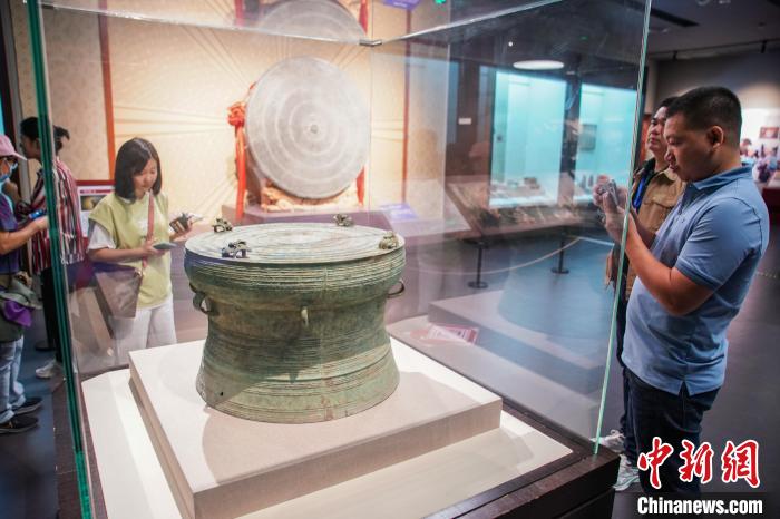外媒代表在广西民族博物馆观看带有青蛙立饰的铜鼓。陈冠言摄