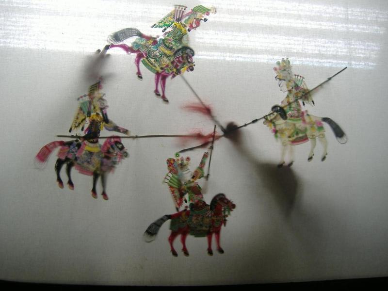 《三英战吕布》则以三国题材为故事背景,东汉末年,董卓派手下第一猛将——吕布把守虎牢关,挡住了诸侯联军,吕布接连斩杀诸侯们派出的先锋,张飞出战,与吕布大战数十回合难下高低,关羽加入战斗,还是僵持不下,这时刘备也赶来助阵。三兄弟与吕布大战难分上下,约定择日再战的故事场景,被一场皮影戏演得惟妙惟肖。