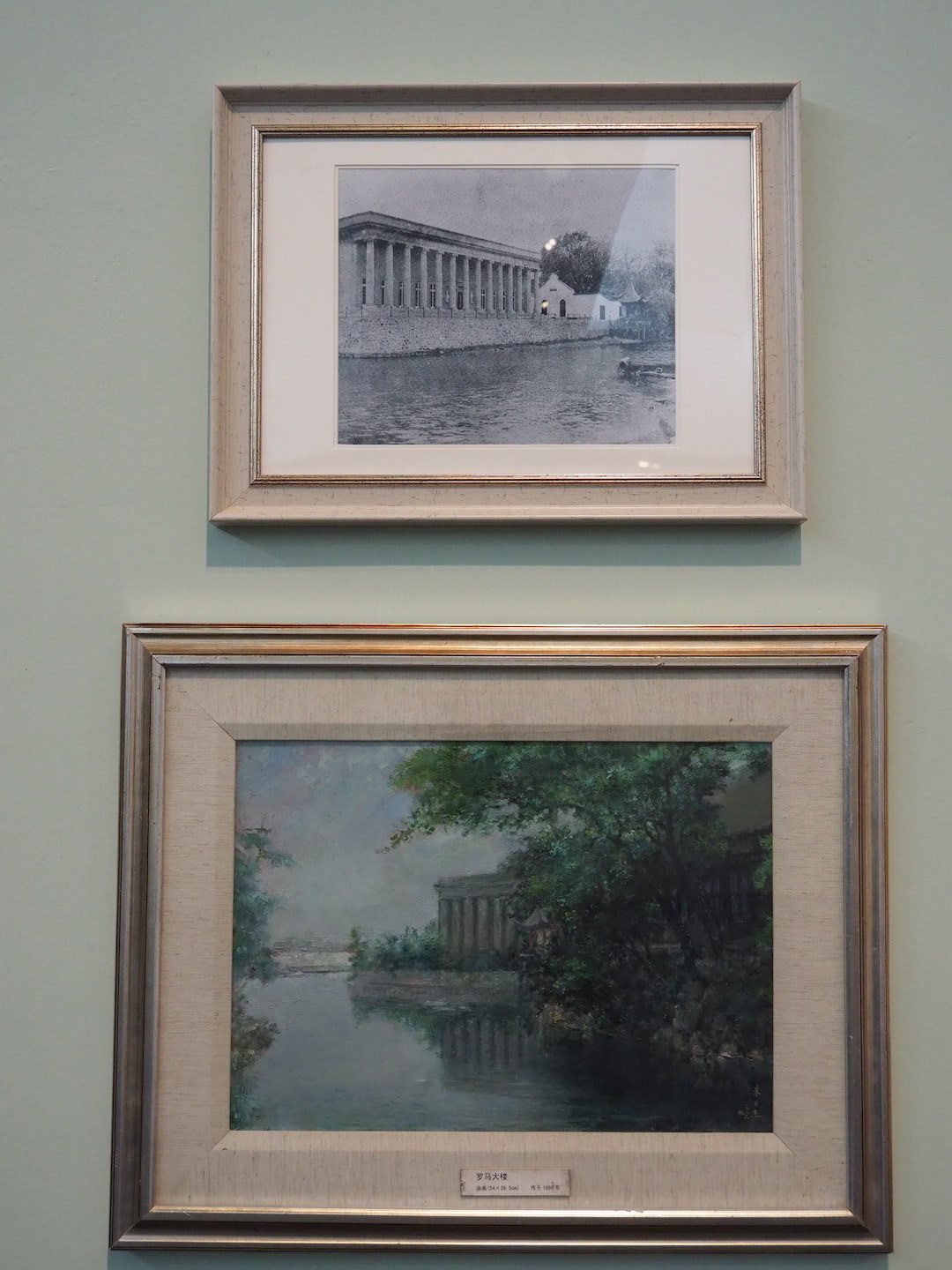 展览的第一组展品,是一张苏州美专的老照片与朱士杰1986年的油画《罗马大楼》。
