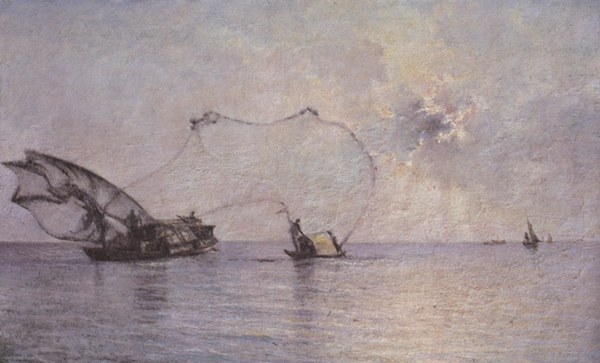 1987年上海人民美术出版社的《朱士杰画选》的封面,是1972年的油画《撒网》。记者在展厅里看到这幅画时,尽管隔着玻璃罩子,尽管画面有裂痕,但“早晨太阳里晒鱼网”“轻撒网,紧拉绳,烟雾里辛苦等鱼踪”的诗意,荡漾眼前。