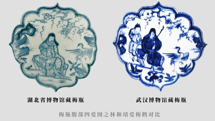 △两件梅瓶在郢靖王墓中出土时的情景。(左为四爱图梅瓶,右为青花龙纹梅瓶)