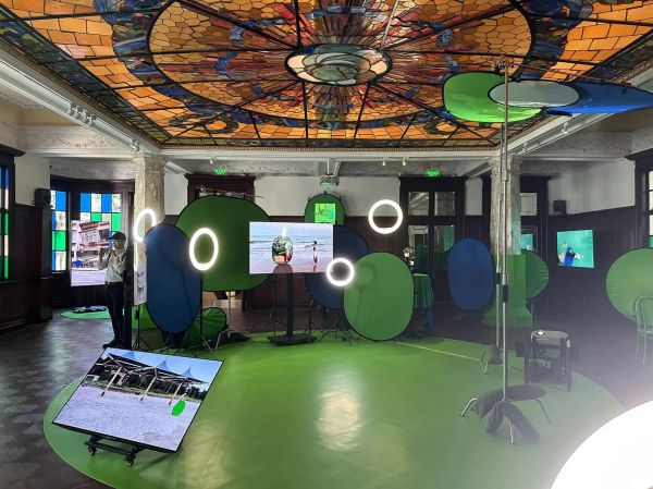 荣宅最为醒目的舞厅空间化身为一个不同尺寸绿幕背景组成的“直播”空间。这是曹斐作品《屏幕自传(上海)》,在这件作品中,一系列使用绿幕拍摄的短视频在LED监视器上循环播放。舞厅化为的展厅,形成了一个临时的实时摄影棚,在这里,真实与虚拟、夸张与扭曲、熟悉与陌生之间的界限变得模糊不清,使参观者难以信任图像的现实性。