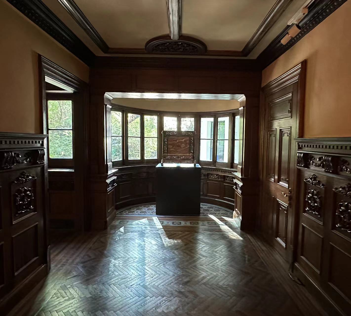 在上海荣宅不同的房间中,“屏风”以各种形式撞入视野之中。在二楼两间相通的房间,呈现了17世纪和18世纪的两件中国屏风,其中一件摆在书桌上的小型立式屏风窗外上海秋日的风景和室内旧时上海的装饰形成对话。明末清初的嵌石插屏是展览中年代最为久远的作品。这种单扇竖屏屏风也是两千多年以来中国最常见的屏风形式。
