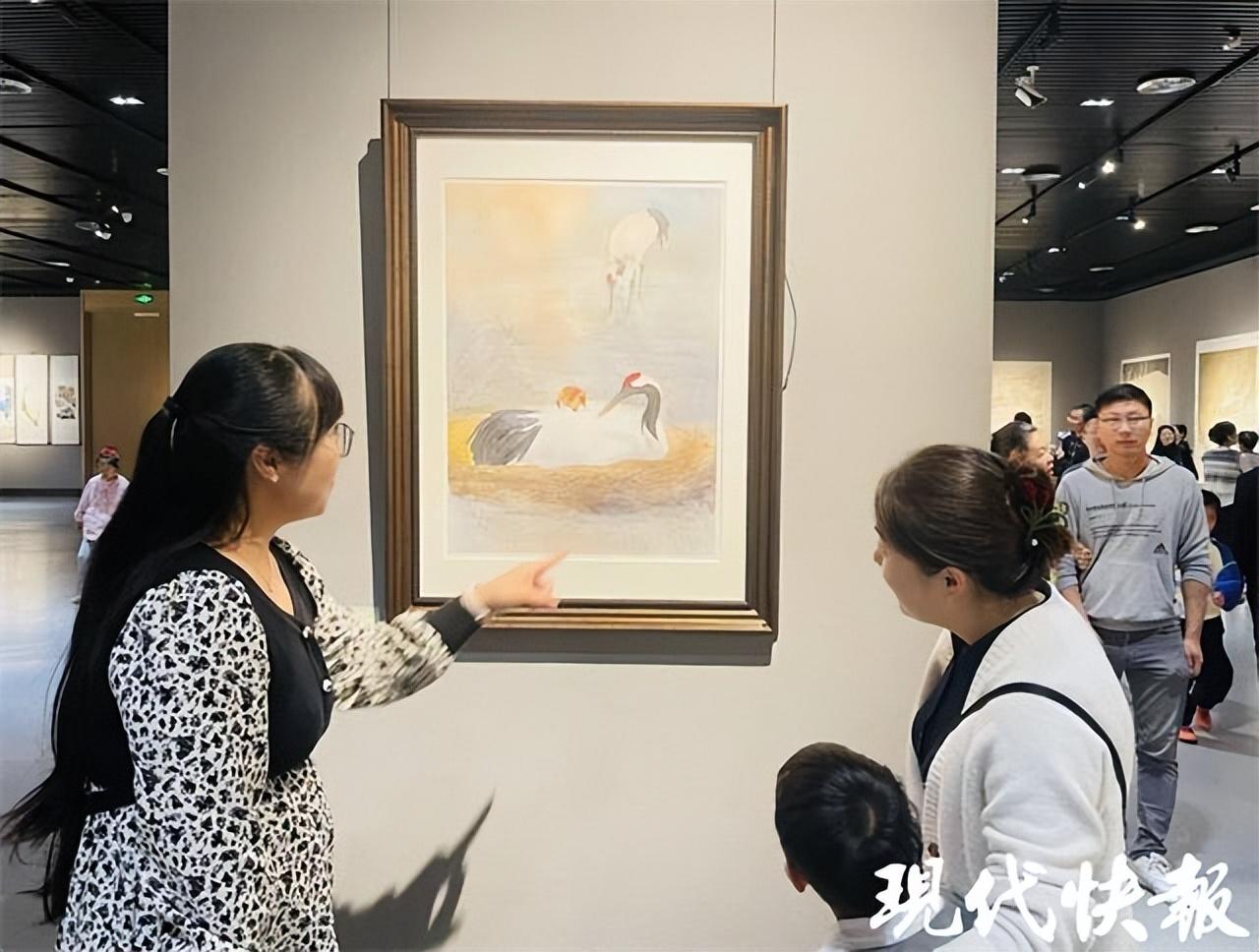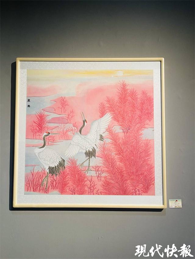 "我的这幅画叫《家园》,是以写实写意相结合的方式来创作的,比如鹤顶写实,后面风景写意,画上的丹顶鹤一家三口,表达了温馨家园的理念。"江苏省美术家协会会员、盐城市经贸高级职业学校专业教师陈苏婷告诉现代快报记者,丹顶鹤是盐城的一张亮丽名片,希望更多人才通过这张名片来到盐城、扎根盐城,在盐城感受到家的温暖。