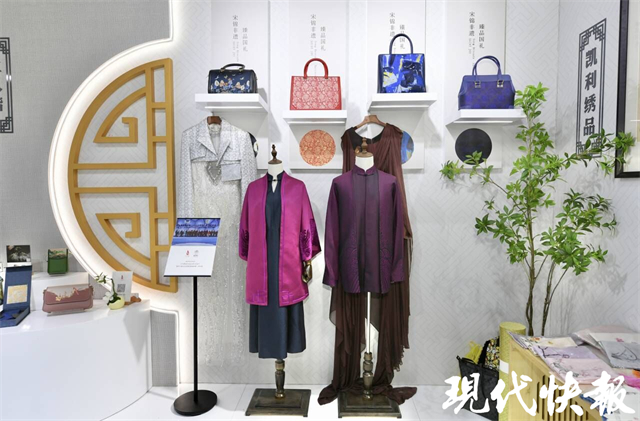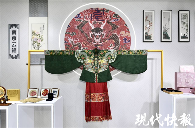 展区内,一件精美华丽的云锦妆花吉服格外引人注目。现代快报记者了解到,该展品来自南京云锦研究所,形制和内容取样自南京云锦博物馆内明孝端皇后吉服复原件。南京云锦研究所品牌营销主管何冠奕介绍,今年已是南京云锦研究所第五次参加进博会,“我们这次还带来了云锦元素的胸针、摆件等文创产品,这样的创新让云锦‘活’了起来,也让云锦文化‘活’了起来。”