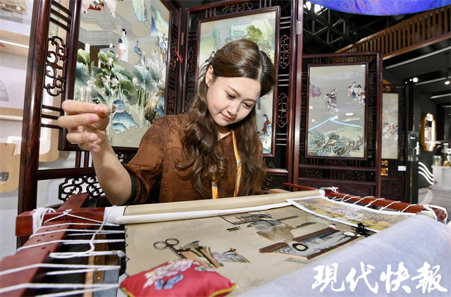 云锦妆花吉服、“重生”的百年古籍《十竹斋笺谱》……11月5日,第六届中国国际进口博览会在“四叶草”国家会展中心(上海)盛大开幕。当天下午,现代快报记者打卡了江苏人文交流活动展台。江苏展区划分为“指尖锦绣”“匠心璀璨”“苏式生活”三大板块,汇聚23家老字号企业的120余件传统精品与创意新品。现场还设有云锦织造、掐丝镶嵌、盘扣制作、饾版印刷等传统手工技艺互动体验项目,以及宋锦服饰秀、精致珠宝秀等视觉表演,多角度展现苏式风韵。