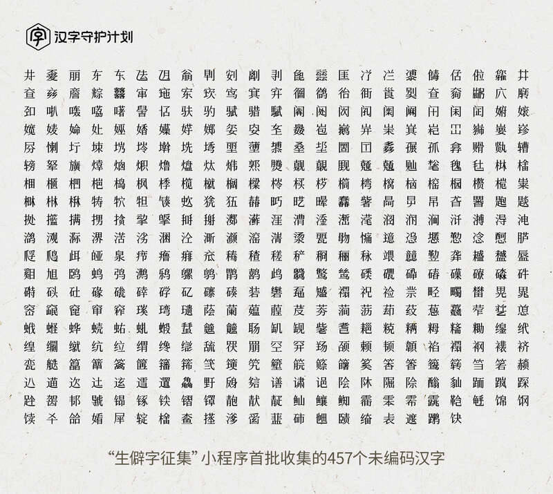 据不完全统计,全国有6000余万人的姓名,以及大量地名、古籍、方言中包含生僻字,其中多数尚未实现数字化。去年11月,腾讯联合工信部电子工业标准化研究院等多家机构与企业,共同发起“汉字守护计划”公益行动。该计划于今年4月20日世界中文日上线“生僻字征集”小程序,直接面向公众征集无法输入的生僻字。