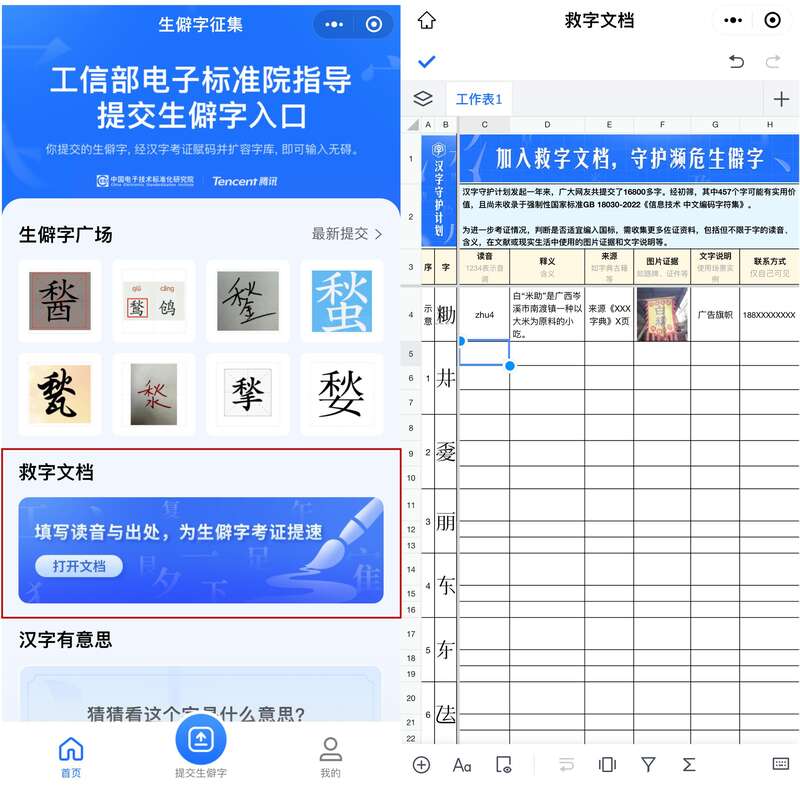 为进一步助力提升申请编码资料的考证效率,“生僻字征集”小程序内全新上线 “救字文档”功能,支持全国各地用户低门槛参与,微信搜索“生僻字征集”小程序即可加入,填写汉字的读音、来源等信息。