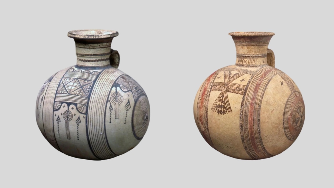 △(左)单耳几何纹茧形壶平山郁夫丝绸之路美术馆藏(右)彩绘几何纹陶茧形壶美国大都会艺术博物馆藏