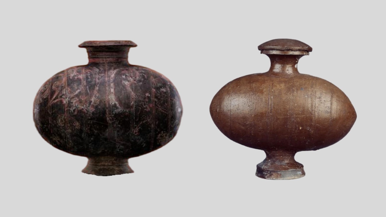 △(左)彩绘茧形壶平顶山博物馆藏(右)西汉髹(xiū)漆茧形壶连云港市博物馆藏
