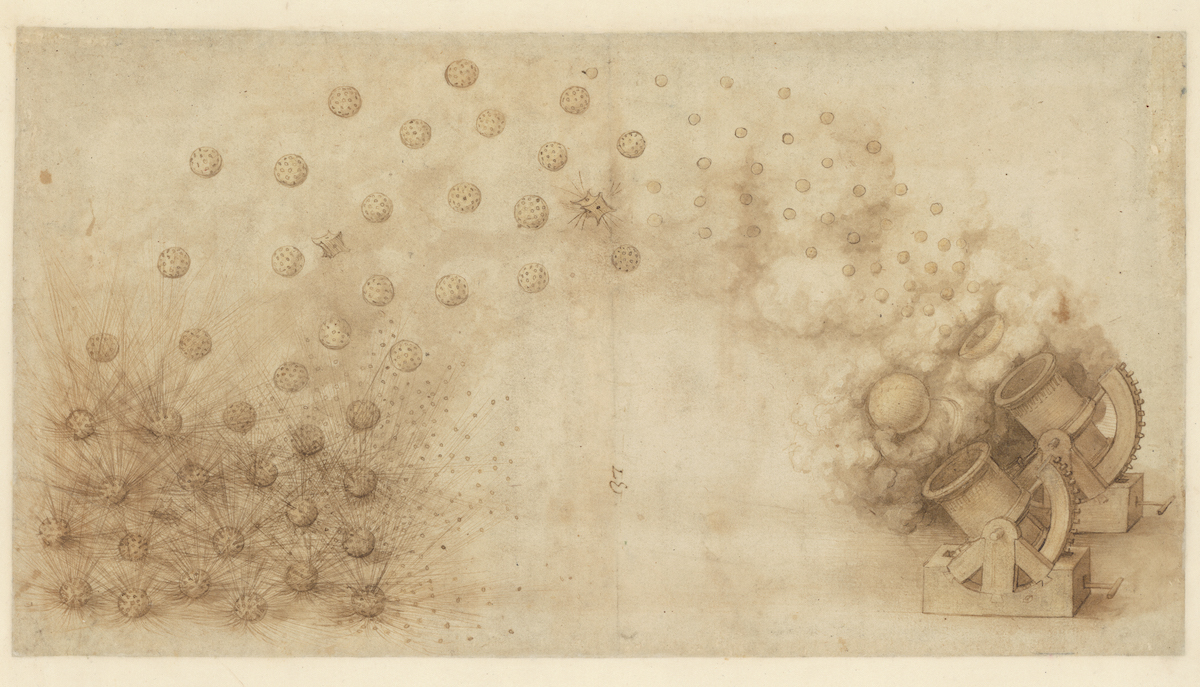 《发射炸弹的大炮》1485年《大西洋古抄本》列奥纳多·达·芬奇(1452-1519)米兰盎博罗削图书馆