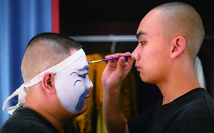 步入后台,年轻演员们或涂抹油彩、勾画眉目,或梳理髯口、佩戴钗环,或开嗓练声、熟悉走位,忙碌有序中透露着难掩的激动。