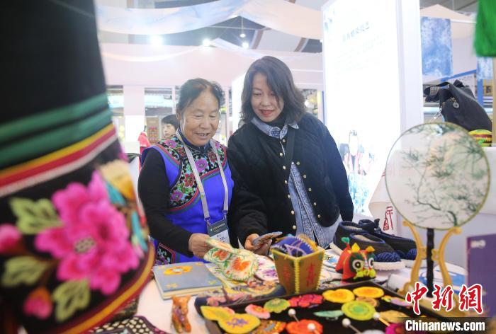 来自云南省楚雄彝族自治州武定县的普玉珍,今年62岁,带了彝族服饰进行展销。她介绍,2014年彝族服饰入选第四批国家级非物质文化遗产代表性项目名录,她现在是该项目的国家级非遗传承人。
