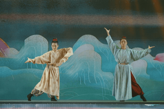 在第一篇章《念想一枕星河入梦来》中,梦里有绣娘、有侠客、有络绎不绝的不同身份的面孔。舞者们身穿精美的服装,带着鼓,舞姿闲婉柔靡,如诗如画。整个舞台就像一场美梦,带观众穿越到了另一个时空,让人感到震撼和陶醉。