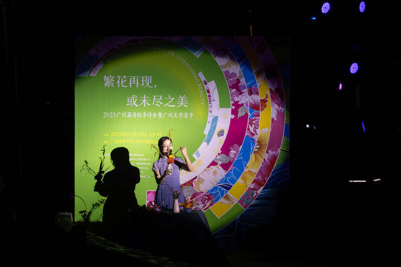 中国青年报客户端讯(中青报·中青网记者林洁)11月18日晚,一场以“花”为主题的视听动感诗会在广州市荔湾区大沙河湿地公园举行。主办方称,“繁花再现,或未尽之美:2023广州荔湾秋季诗会”处处体现“花”意,展现广州繁花浪漫的风景,传递了一种芬芳的精神力量。