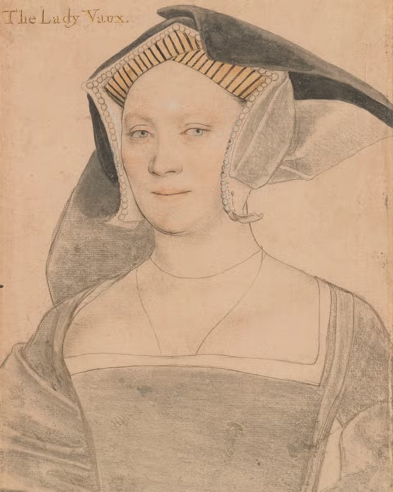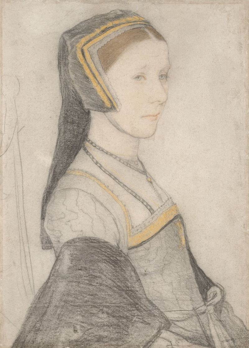 霍尔拜因,《玛丽·谢尔顿》(安妮·博林的表亲,后来嫁给了安东尼·赫文宁汉)这是霍尔拜因最细致的草图之一,他对五官进行了特别的关注,用细小的线条表示鼻子的造型。白色用于衬托出谢尔顿的眼睛和她脖子上吊坠上的珍珠。