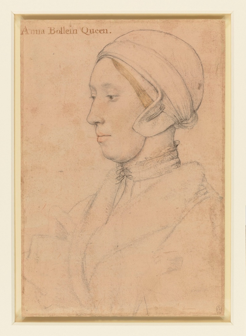 霍尔拜因,《安妮·博林》(亨利八世第二次婚姻的妻子为数不多的当代肖像之一,安妮穿着一件非正式的礼服,可能是亨利送给她的礼物。这幅画没有对应的肖像完成。)