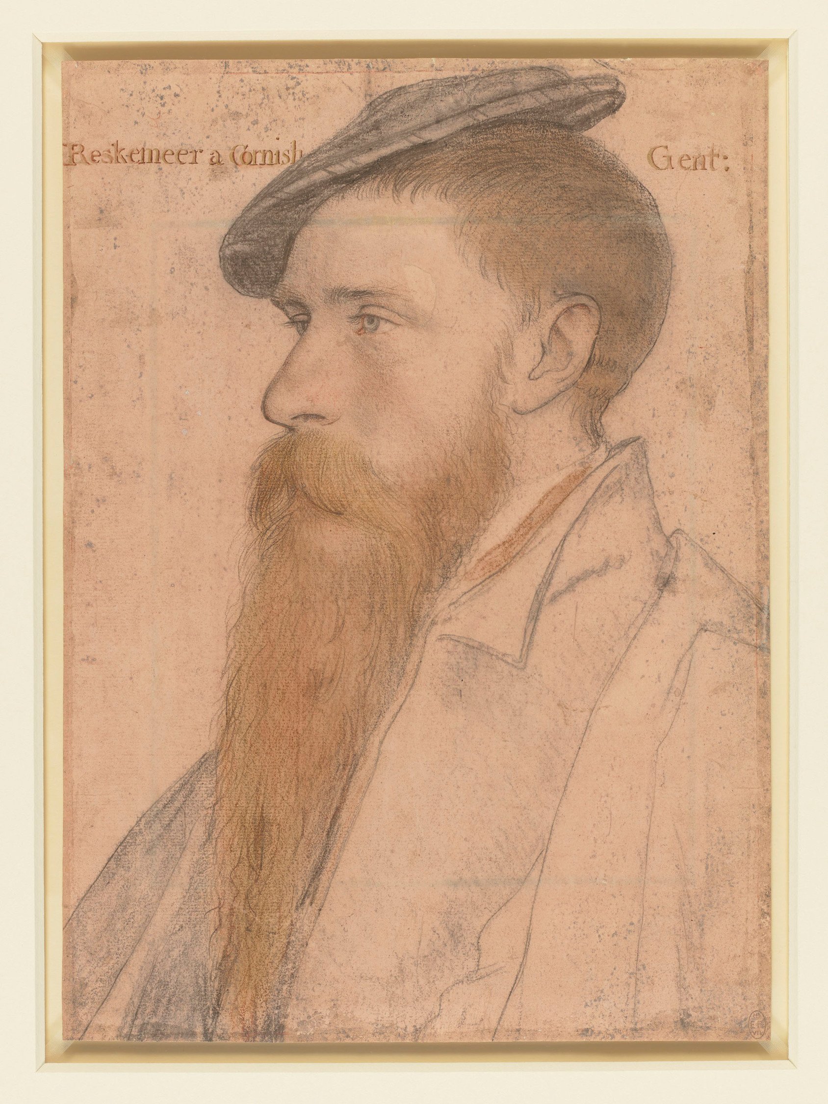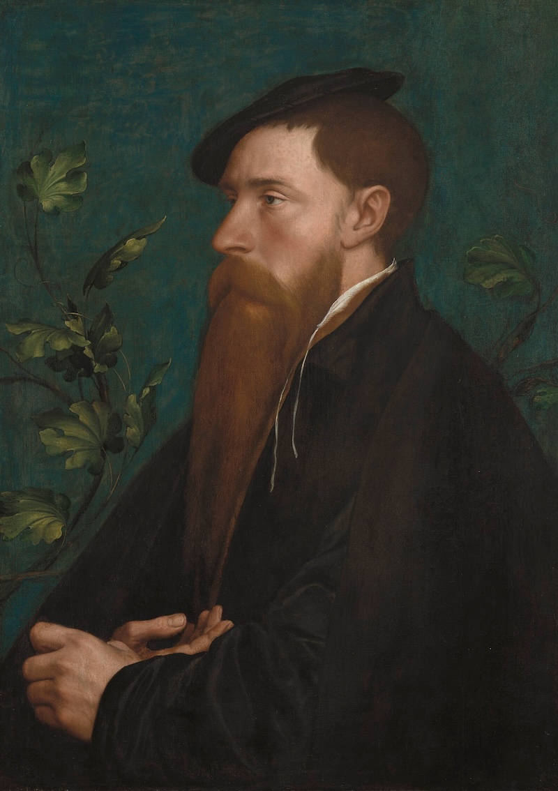 霍尔拜因,《威廉·雷斯基默》(威廉·雷斯基默在亨利八世的宫廷中担任过多个次要职位);这幅画描绘了他留着长长的红胡子,在藤蔓背景下。