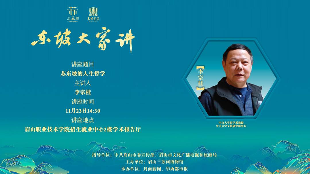 11月23日下午,李宗桂教授将在苏轼故里眉山,带来“苏东坡的人生哲学”主题讲座。封面新闻APP将对本场讲座全程直播,不能亲临的朋友亦可以关注封面新闻APP线上收看。
