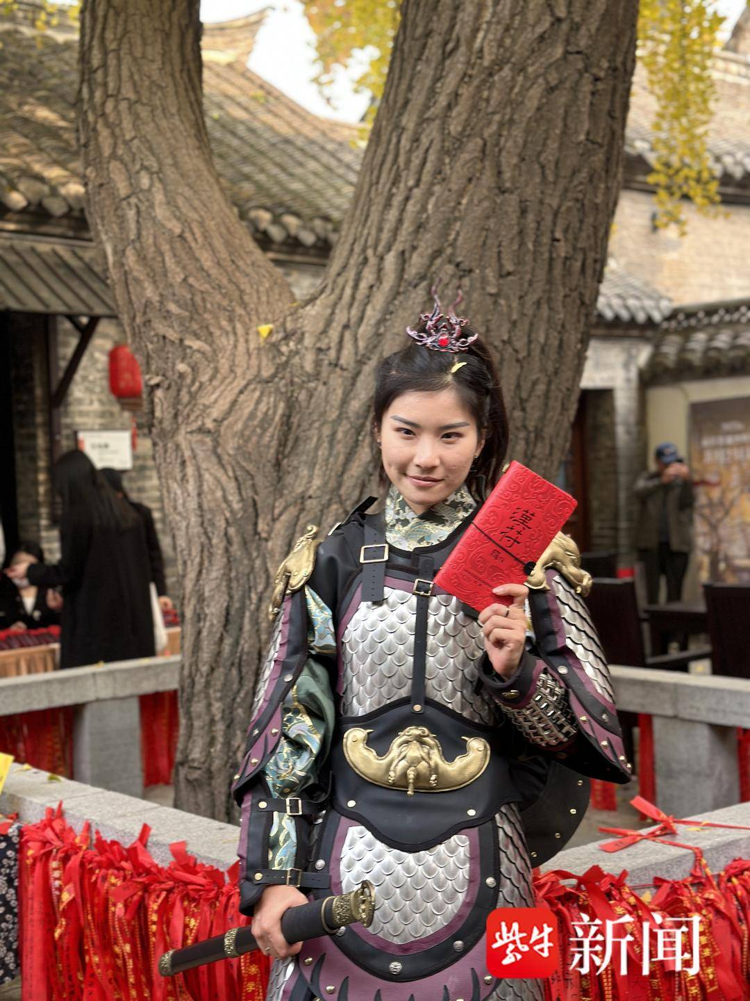 记者注意到,当天有不少游客身着汉服前来。其中一位年轻女孩身着明朝甲胄,单手持剑,英姿飒爽的模样尤为引人注目。据女孩介绍,她叫杨清潇,00年出生,是一位汉服爱好者。在看到云龙文旅公众号上发布的“汉符”上线消息后,她第一时间就在线上进行了抢购。“‘汉符’中记录了很多徐州代表性的地标、景点,我觉得非常有纪念意义,所以发布后马上就抢了。”杨清潇笑着说道。