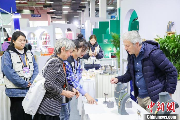 第十七届杭州文博会现场,一名外国嘉宾光顾手工饰品摊位。杭州文博会供图
