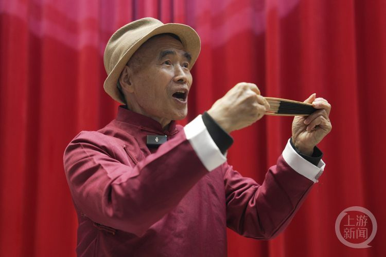 在台上的老人穿着一身红色的长衫,表演时手里的扇子随着故事的转折开合,他的每一句话都随着故事情节转换着不同语气,表情也随之变化,他正在讲一个母亲教育孩子不要“小偷小摸”的故事。