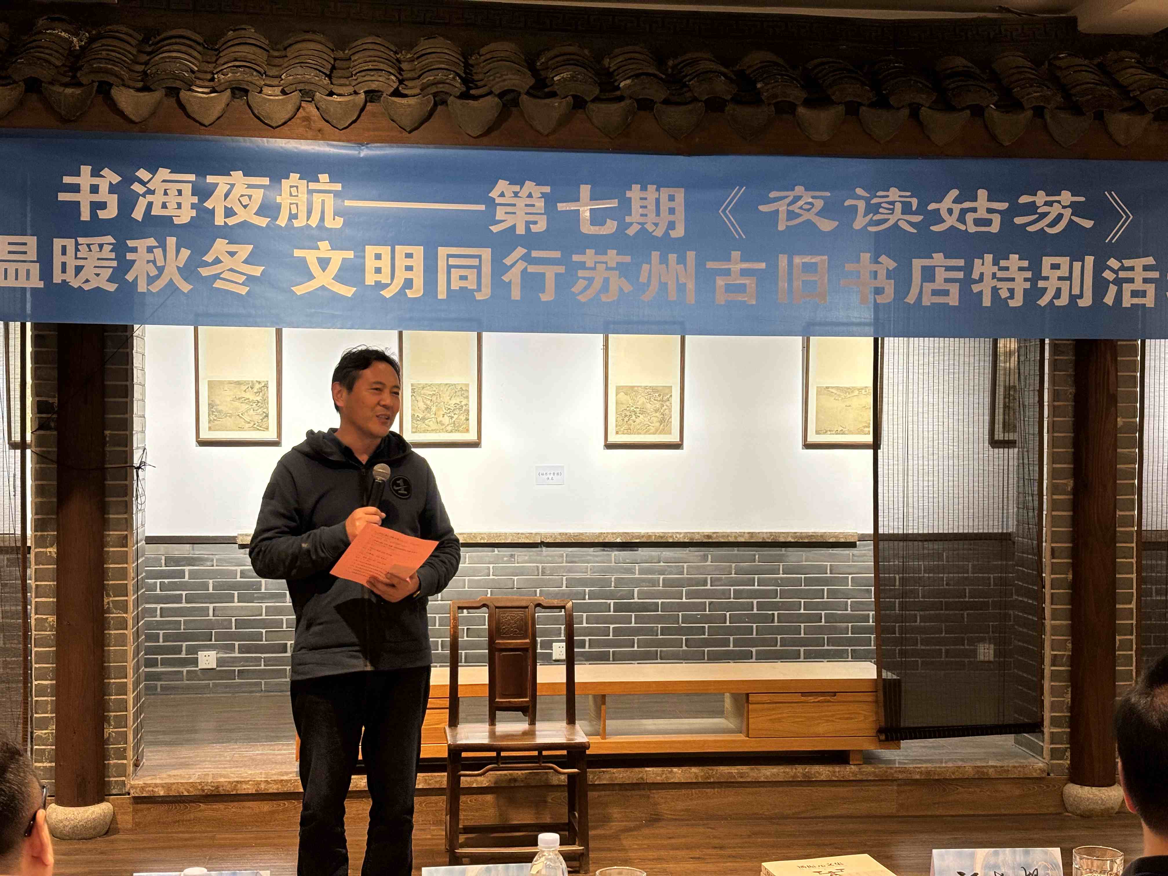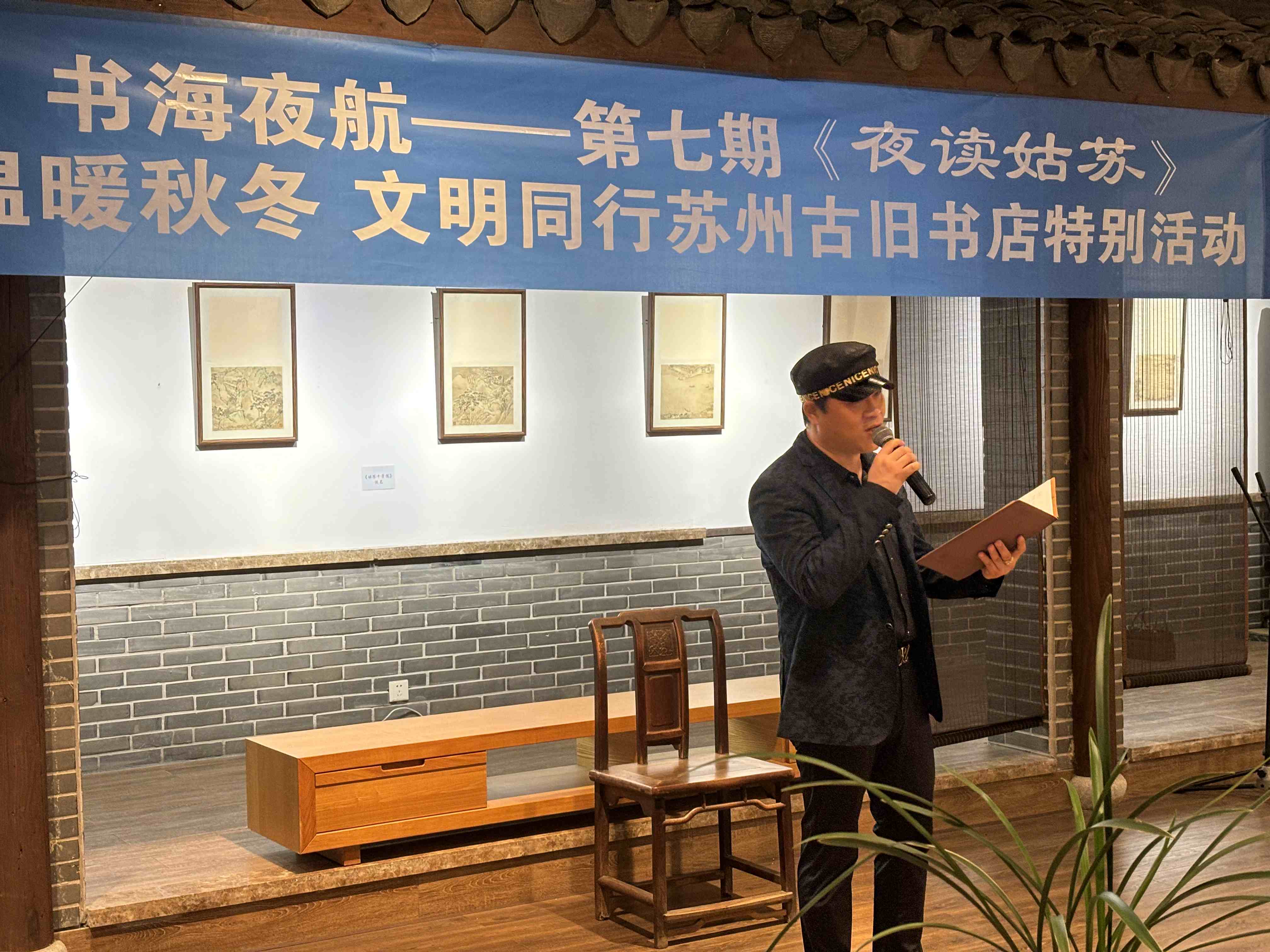 活动现场,江南文化推广人沈建良表示:“癸卯岁末。夜读姑苏也走过了四季,春夏秋冬。在姑苏古城的东西南北,留下了姑苏文化名家大师的一个个脚印。大家对这个文化项目的支持和热爱,体现了苏州浓厚的人文精神和文化品格。夜读姑苏这个项目,说小很小,在苏州这颗文化大树底下,就是一粒小种子,一颗小碧螺春。说大也大,项目集聚了苏州文化艺术界的很多老师大师,为大家互动交流提供了一个好平台,一个大气开放的舞台。每一次都有新的朋友加入,每一次都在丰富着活动的内涵。我参与过几次活动,每次徐书僮都在努力改进,创意,创新。衷心希望徐书僮能够坚持,坚持夜读姑苏,在文化这条给人享受、提升境界的道路上,发挥十年磨一剑的韧劲,让夜读姑苏的品牌力影响力越来越大,活动越办越好。谢谢大家。”