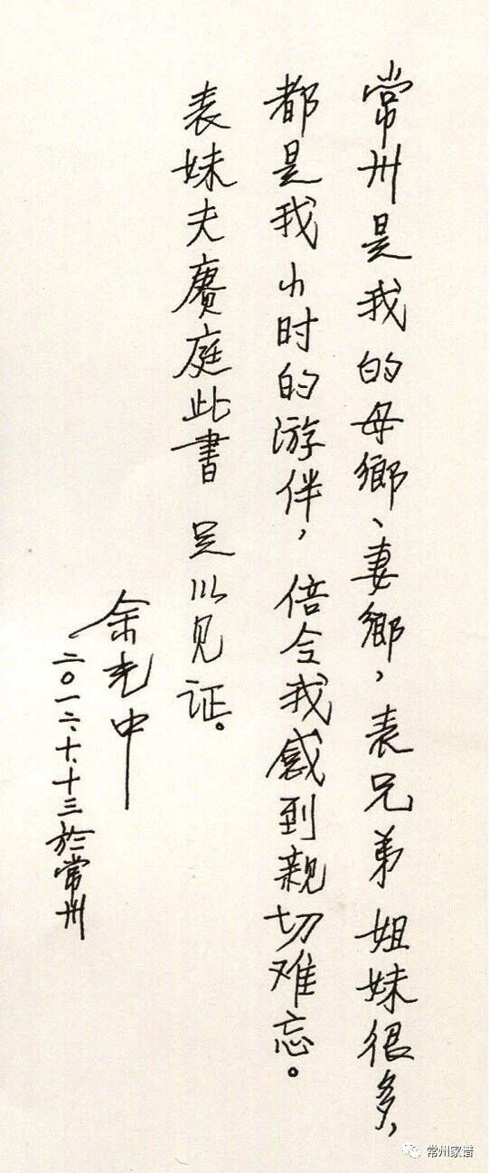 在2012年再次回常州探亲,余光中说,“常州就是我的故乡。”在给亲友的赠言中写到:“常州是我的‘母乡’,也是我的‘妻乡’;‘母乡’加‘妻乡’,那份乡情也不下于‘父乡’了。”