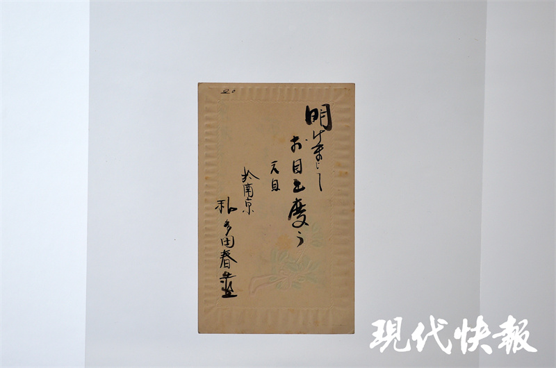 此次公布的文物史料中,还有一封南京大屠杀期间日本士兵寄回京都的军事明信片。明信片的正面写着“上海派遣军和多田春造”以及他位于京都的家庭地址,盖有“南京陷落纪念”军事邮戳,反面写有这名士兵对家人的新年祝福,以及“元旦于南京”。“明信片上很清楚地写明是‘军事邮便’,而且时间地点都很清晰,是日军侵华的一个重要罪证。”卢彦名说。