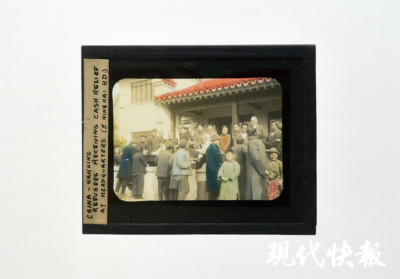 在一栋中式建筑前,一人伏案书写,一群身着冬袄的人们正在排队,其中有人衣衫褴褛,照片中也有一些外国人的面孔,他们是约翰·马吉、米尔斯、斯迈思等国际人士。现代快报记者看到,这份玻璃质幻灯片的画面依然清晰,在照片的左侧写着“CHINA-NANKING,REFUGEESRECEIVINGCASHRGLIEFATHEADQUARTERS(5NINGHAIRD.)”,不仅标明了宁海路5号南京安全区国际委员会总部,也说明了难民正在领取救济金。
