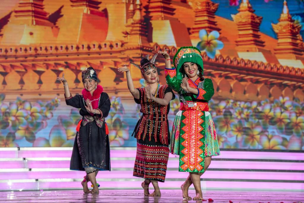11月30日,来自老挝的艺术工作者在表演舞蹈《老挝民族齐跳舞》。
