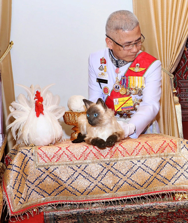 泰国国王加冕礼后,新国王要参加新宫殿的皇家庆典。他将登上王座并在那里过夜。王座大厅里摆放着许多吉祥物和王室礼仪用品,包括一把金钥匙、一个研钵、一些种子、椰子花、槟榔花、一个用雄性白象尾毛做成的拂尘、一只白鸡,当然还要有一只猫。