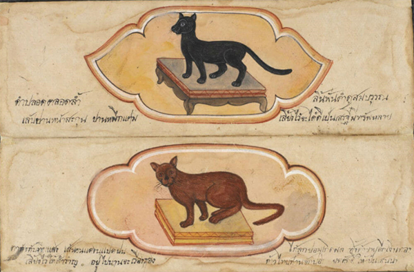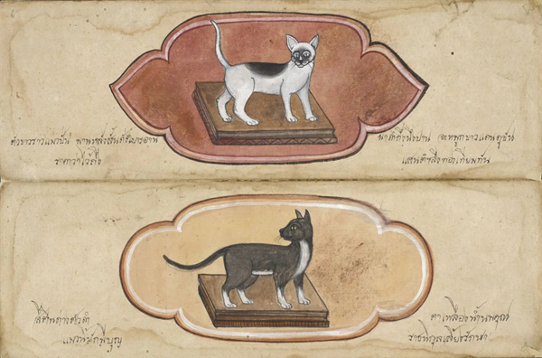 泰国近九成民众信奉佛教,佛教徒尊重生命、爱惜生命,自然不会亏待寺庙里的猫居民。并且,泰国的佛教僧侣对猫咪们的关注由来已久。已知最早的关于猫的泰语手稿《猫之诗》(TamraMaew)出版于18世纪末,据说这本书就是由佛教僧侣撰写的。人们可以在大英图书馆找到这部《猫之诗》。这本书中介绍了23种猫,相关内容可追溯到大城时期(1351-1767年)。国王和当地寺庙将猫分为“吉祥猫”和“不吉祥猫”,认为“吉祥猫”除了能捕食老鼠,还能给人们带来好运,并保护寺庙不受邪恶侵扰。猫备受人尊敬,在当时,杀死一只猫的罪孽就等同于杀死一名僧侣。