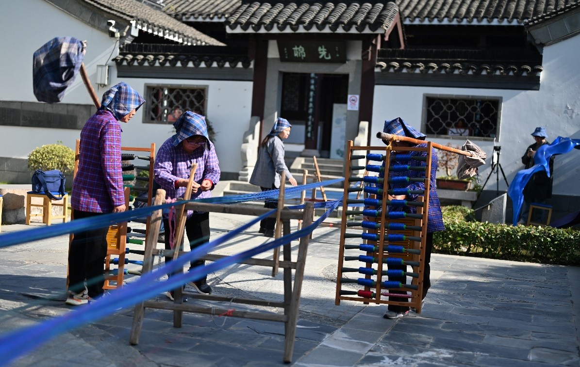 在黄道婆故里先棉雕塑前,一场“经布”活动吸引了大家的目光。不同颜色经线圈和经车在长长的石板路上一字排开,一群身着土布衣的手织布艺人挑着经圈、提着线在几个花架间来回穿梭“跑线”。