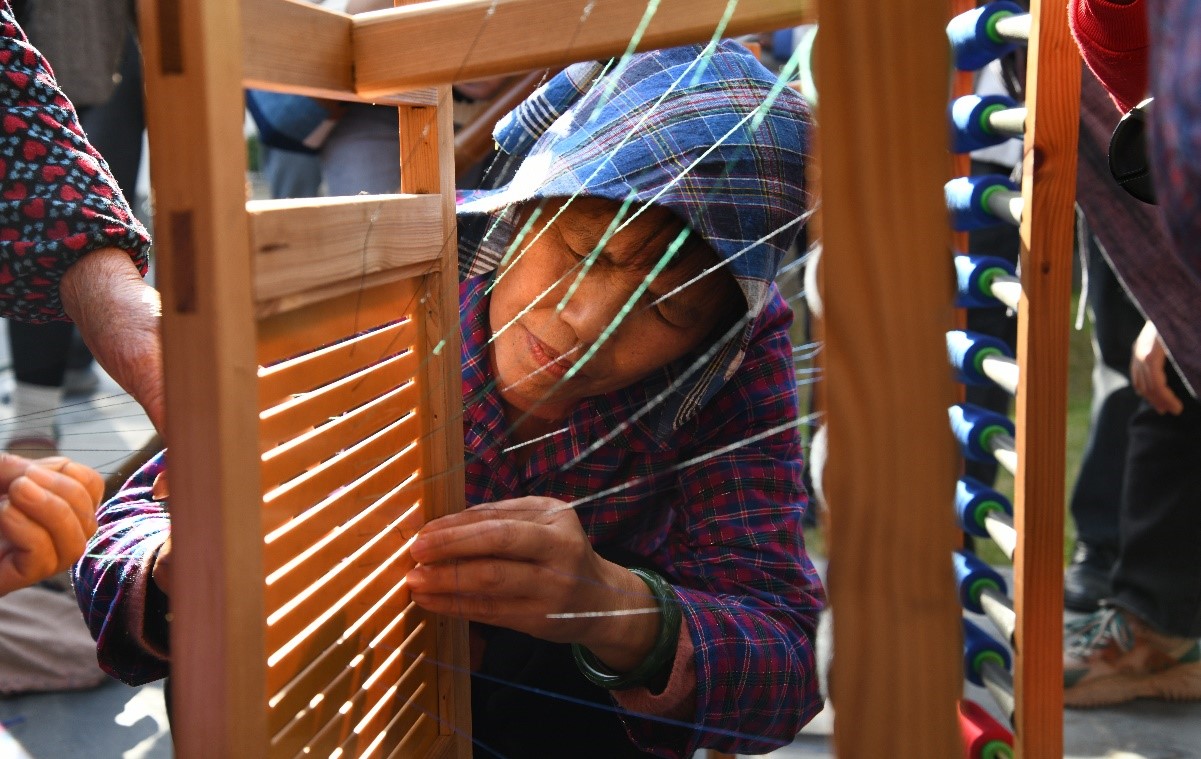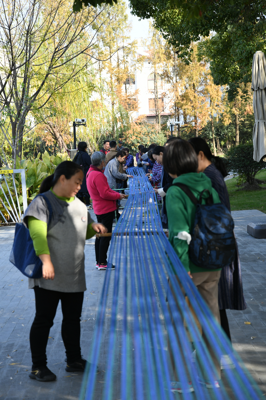 活动现场,这一集体接力的“经布”演示似乎将人们带回了旧日乡村时光。观摩人群也被织娘们专注的工作以及传统手工纺织的魅力所感染。大家虽不相识却迅速默契地组合在一起,有的整理线圈,有的上阵排线,有的参与跑线,更在盘线时每一节点接力,俨然再现了乡村集体经线纺织的盛景,形成了一个找寻城市记忆与技艺的共同体。