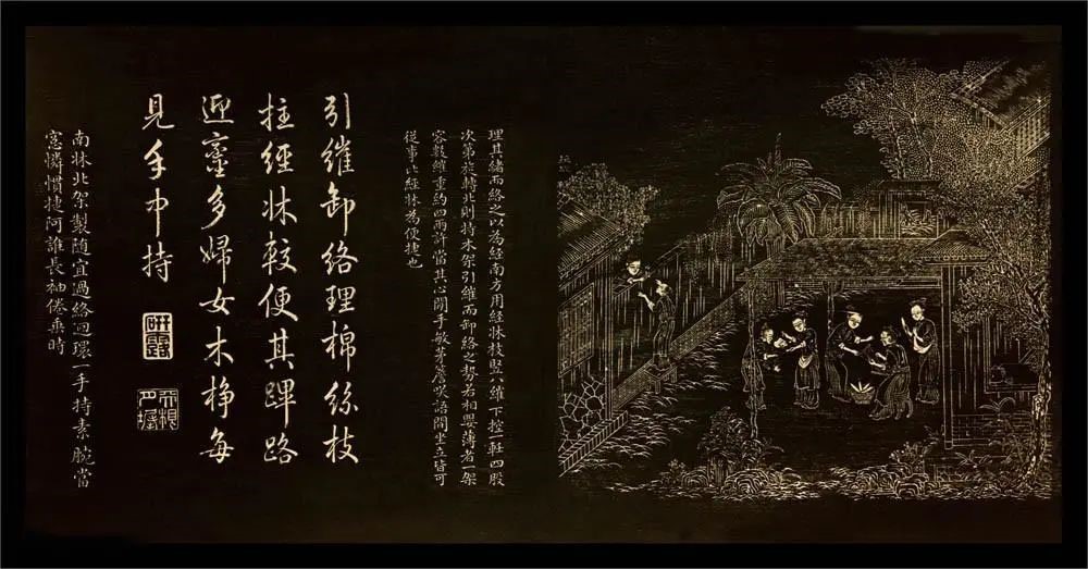 江南传统手织棉布的工艺极为复杂,大体有轧花、弹花、整棉絮条、纺线、打线、落线、整花型、经布、闯杼、掏综、栓机、织布、了机、修布等大大小小72道工序。在黄道婆纪念馆公园东北角墙面上,就刻有清代直隶总督方承观编绘的《御题棉花图》,完整地描绘从植棉、管理再到织纺、织染、成布的全套图谱。其中经布是织布过程中最重要的工序之一。