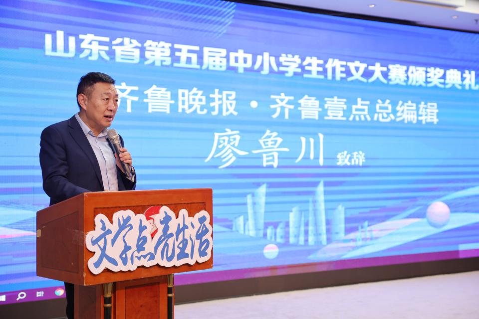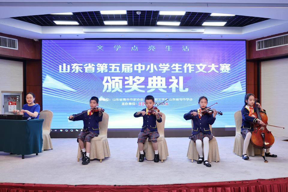 颁奖仪式在文东小学器乐小合奏《蓝精灵》的欢快曲调中拉开序幕。齐鲁晚报·齐鲁壹点总编辑廖鲁川代表大赛的主办方致欢迎词。他在介绍了齐鲁晚报·齐鲁壹点发展和文化的同时,对各位获奖的“齐鲁小作家”们表示了祝贺。在致辞中,他代表齐鲁晚报·齐鲁壹点向孩子们发出邀约,欢迎各位“小作家”更多地参与到报社举办的青少年活动中,“你们的才华毋庸置疑,为你们骄傲,也希望你们戒骄戒躁,能够在此次成绩之上,再攀高峰,让齐鲁晚报·齐鲁壹点记录你们的成长,我也相信,你们会在这里找到更适合、更广阔的舞台!”